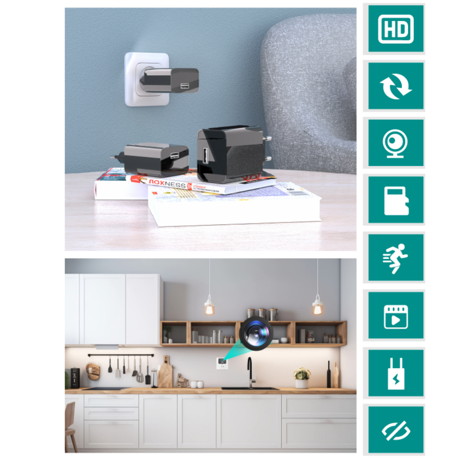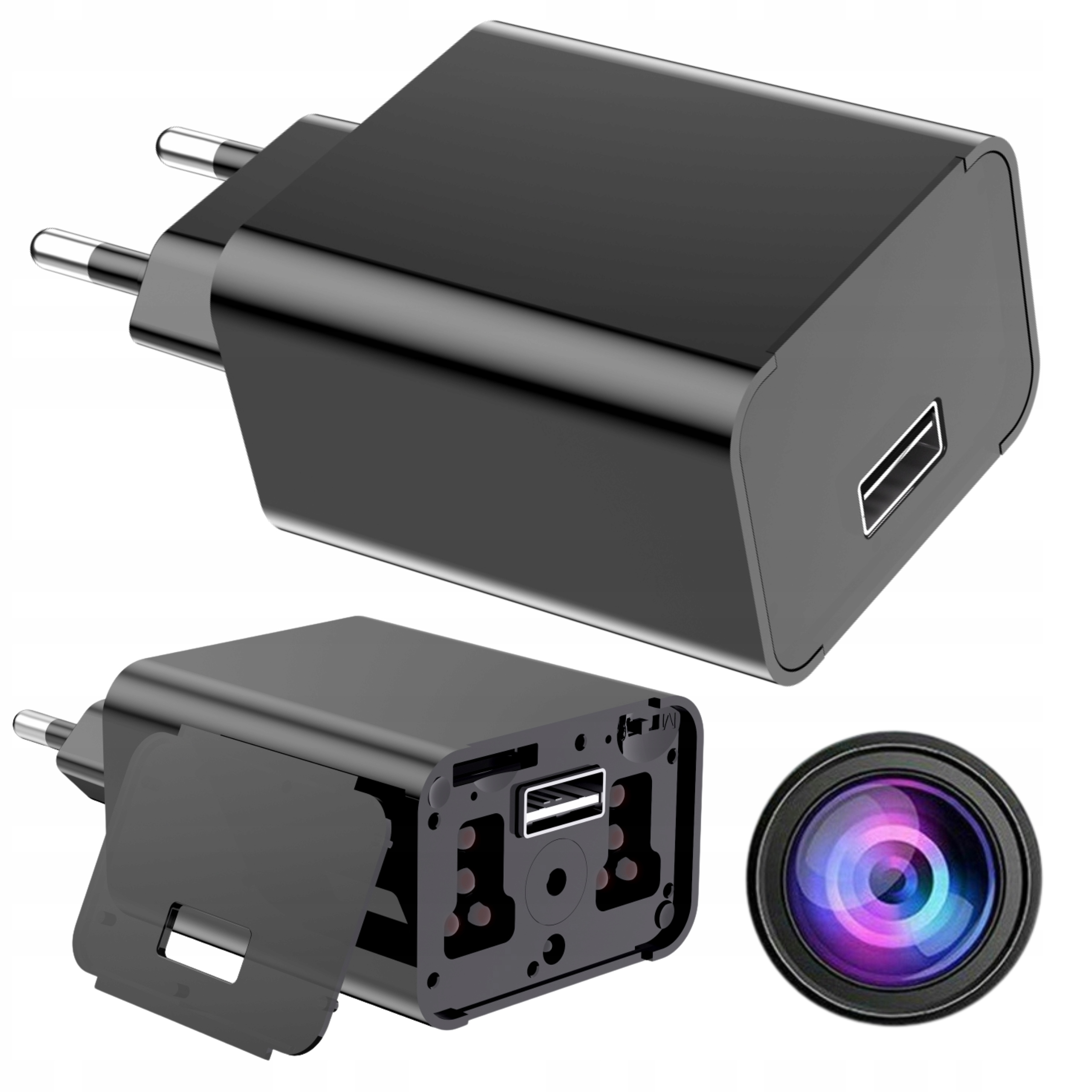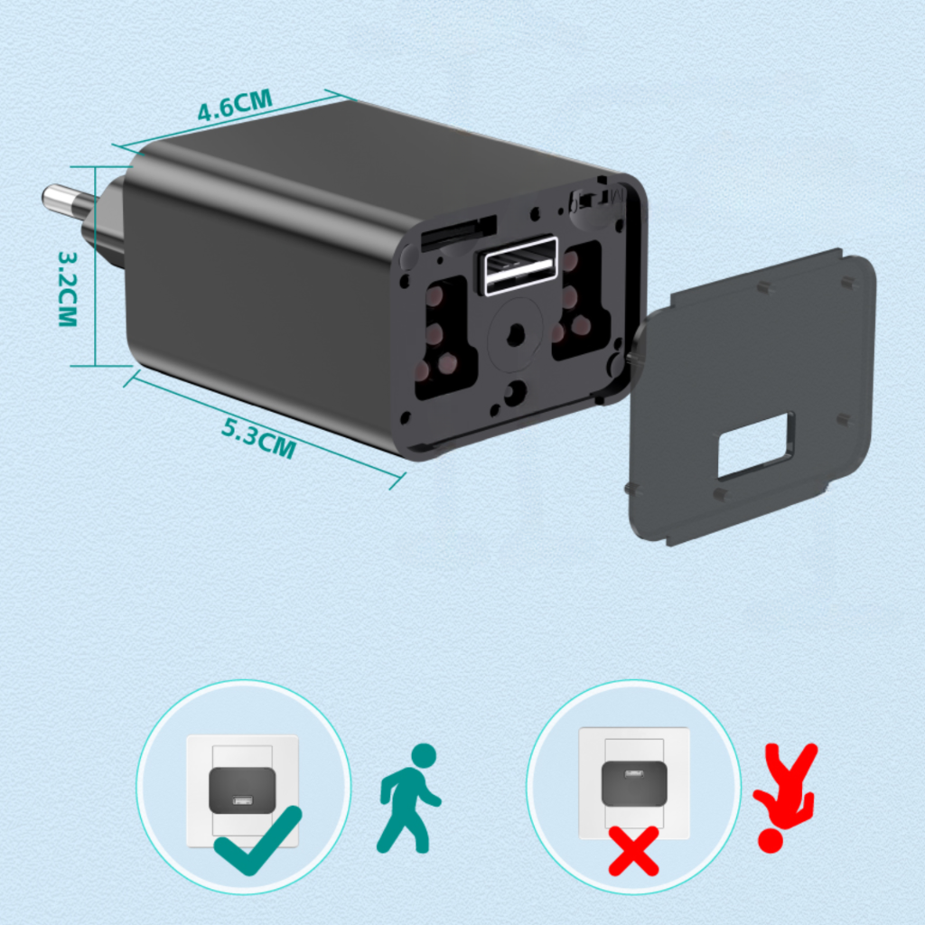 Wygląda jak zwykła ładowarka USB, dzięki czemu nie wzbudza podejrzeń – nikt nie zorientuje się, że w pomieszczeniu znajduje się ukryta kamera.