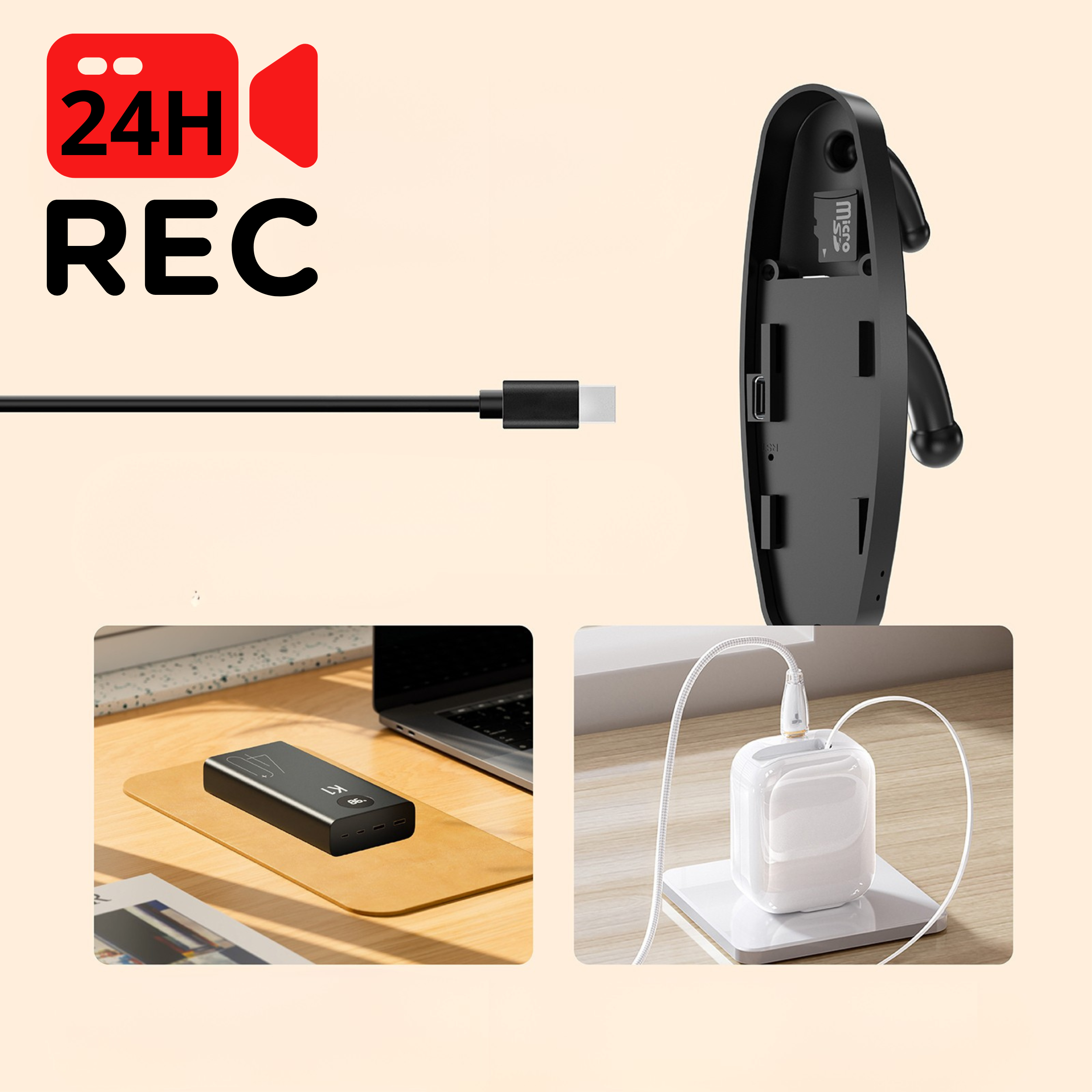 Urządzenie nagrywa w rozdzielczości SD, posiada funkcje zapisu po wykryciu ruchu oraz nowoczesne złącze USB-C do ładowania. Sprawdzi się jako element domowego monitoringu, ochrona przed kradzieżą czy sposób na gromadzenie dowodów.