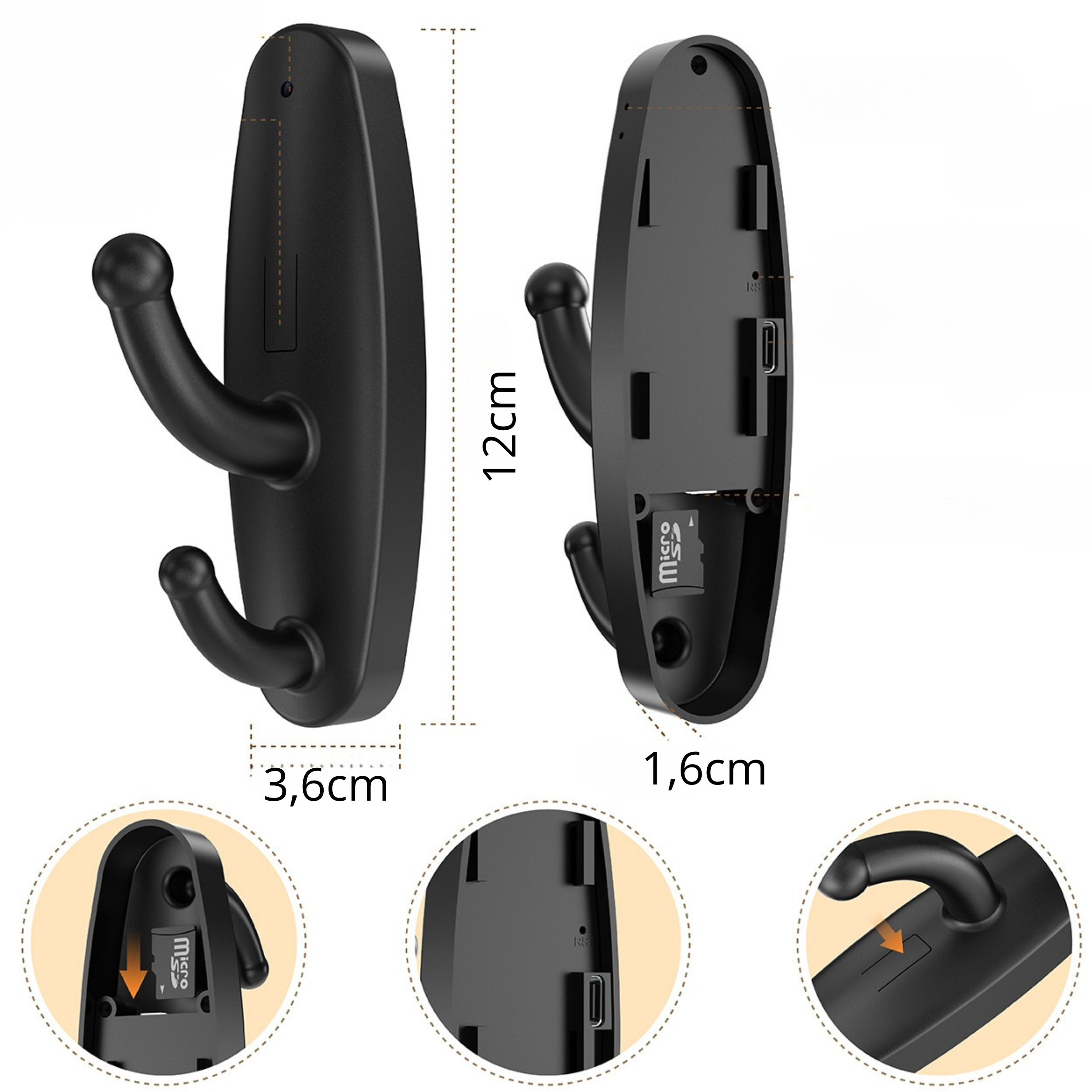 - Obsługiwane karty pamięci: microSD 16 GB / 32 GB (brak w zestawie) Obudowa: imitacja tradycyjnego wieszaka
