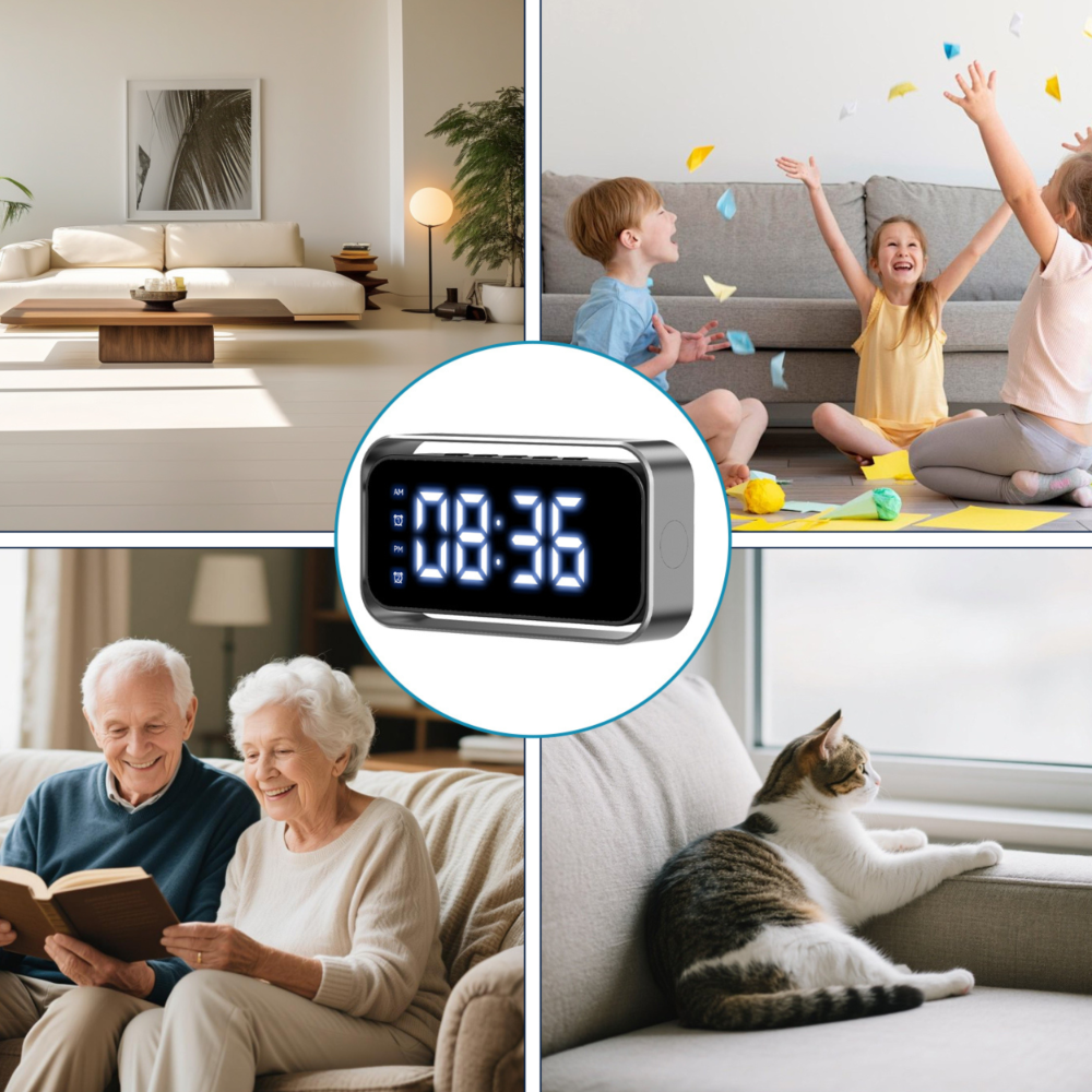 - Ten nowoczesny zegar biurkowy skrywa w sobie zaawansowaną kamerę szpiegowską Wi-Fi 5GHz, zapewniając płynny podgląd na żywo bez opóźnień. Urządzenie jest w pełni zintegrowane z aplikacją Tuya Smart.