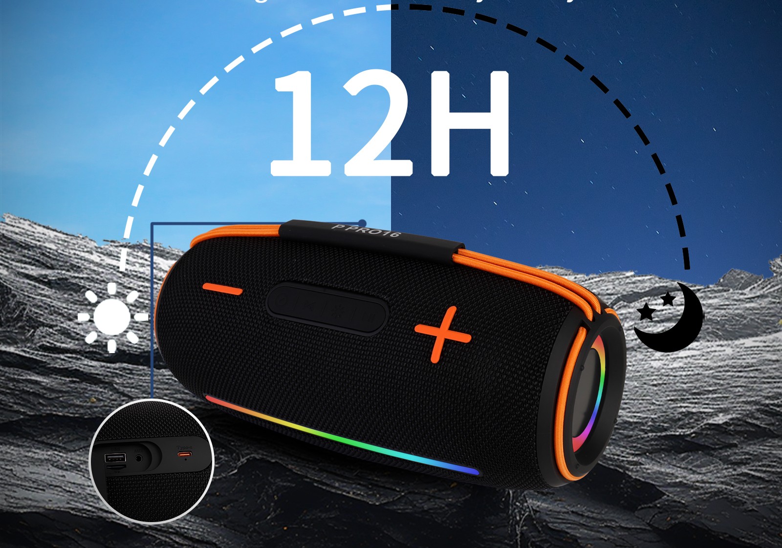 Dzięki pojemnemu akumulatorowi 3000 mAh głośnik działa od 3 do 4 godzin, co czyni go doskonałym towarzyszem podróży i plenerów.
