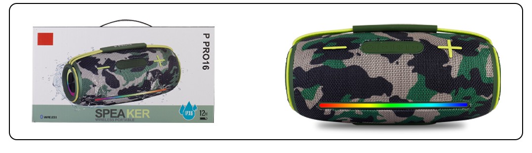 - Militarny wzór moro, głośnik Bluetooth Pro16 to wytrzymały sprzęt dla miłośników outdooru, który dostarczy mocnego i czystego brzmienia. Wyposażony w technologię Bluetooth, zapewnia niezawodne i bezprzewodowe odtwarzanie muzyki podczas każdej wyprawy.