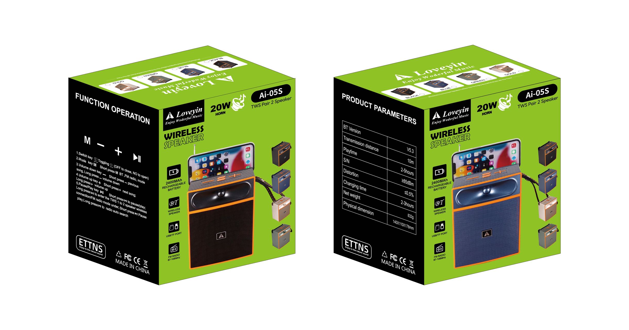 - Głośnik Bluetooth AI-05 to doskonałe połączenie stylu i funkcjonalności, które zapewnia dynamiczny i bogaty dźwięk w każdym pomieszczeniu. Dzięki zaawansowanej technologii Bluetooth gwarantuje szybkie i stabilne połączenie z Twoimi urządzeniami mobilnymi.